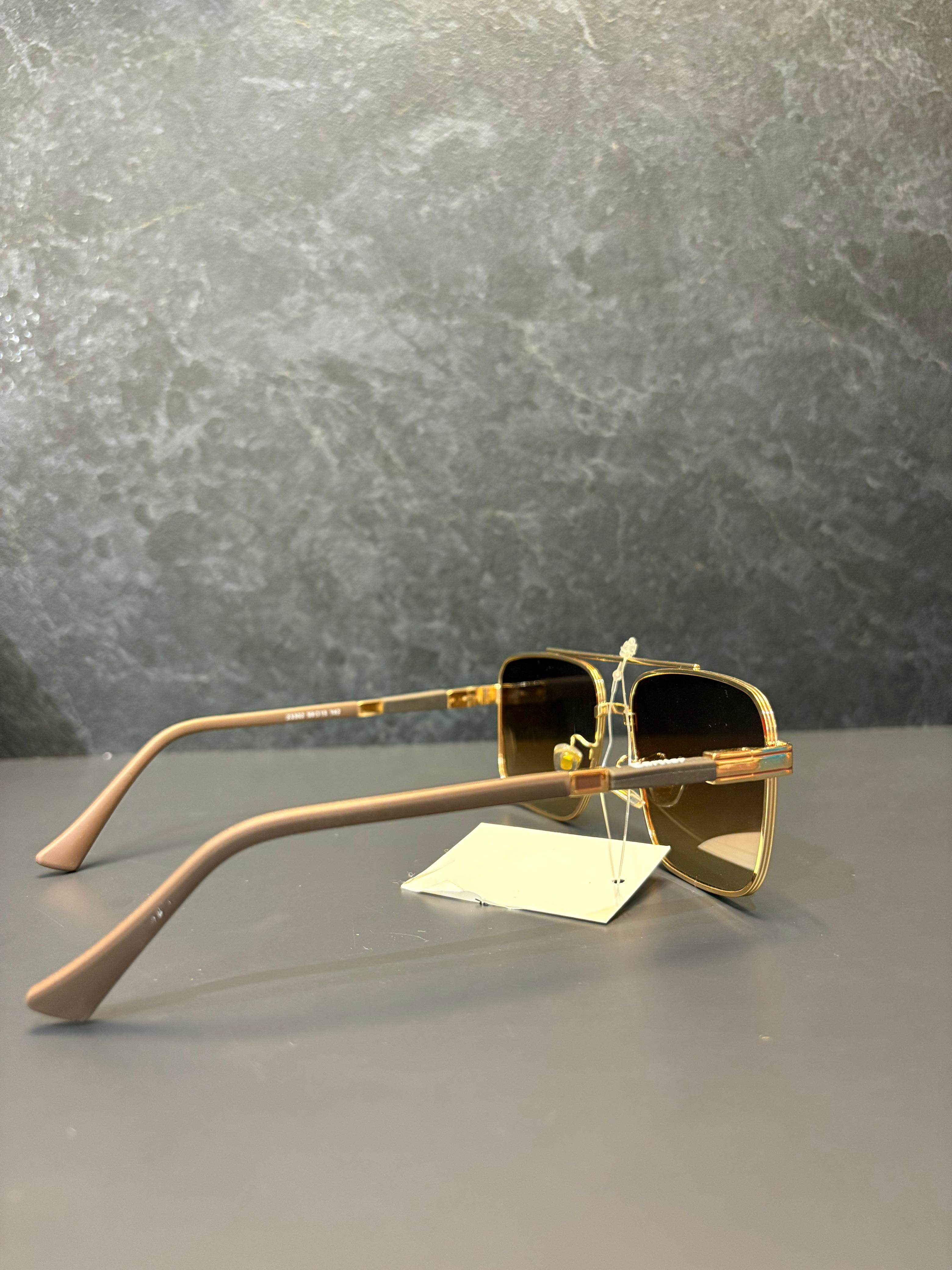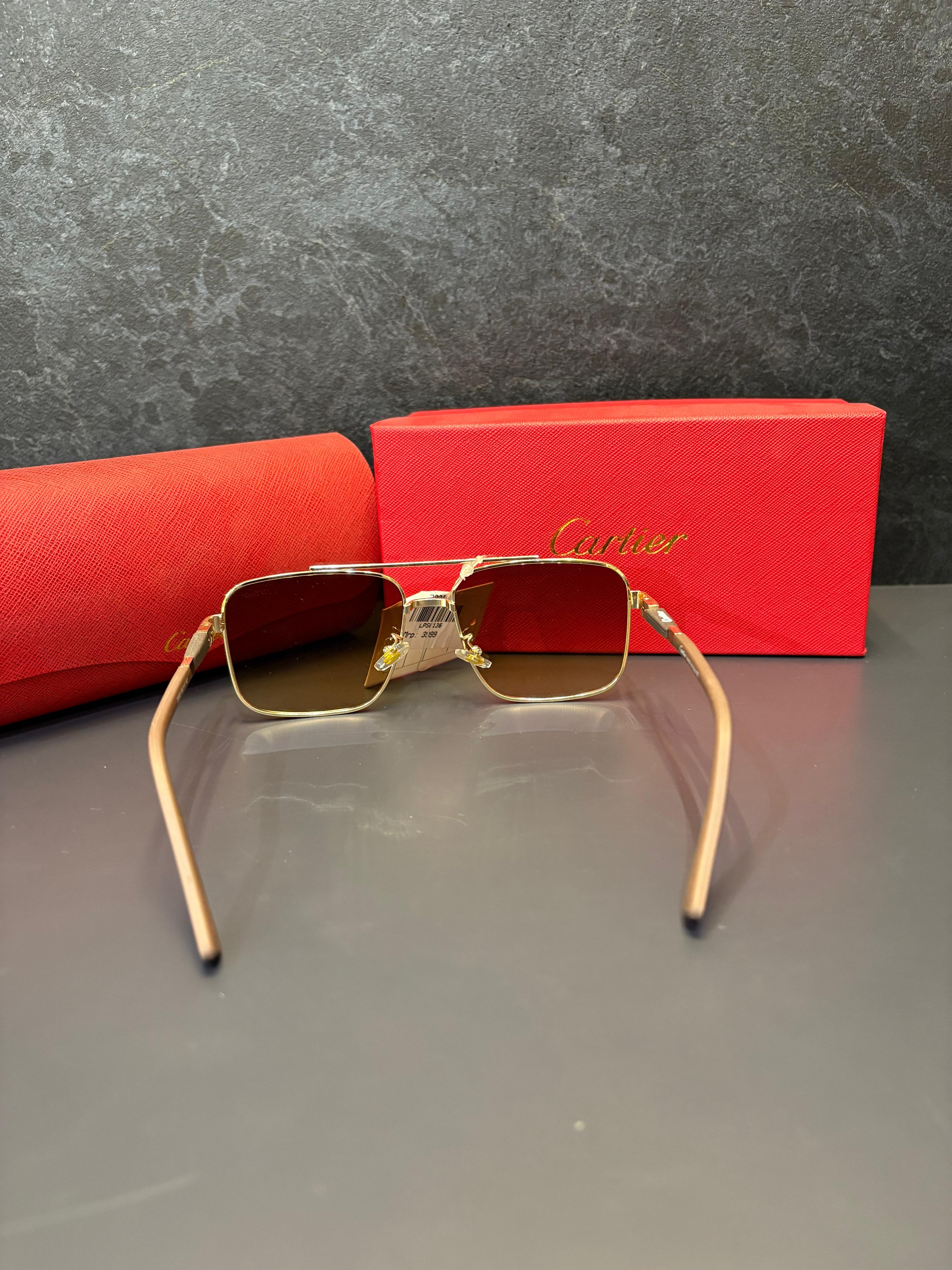 Cartier Gold Aviator Sunglasses – A perfect blend of elegance and bold style. These sunglasses feature a premium gold metal frame, square aviator shape, and brown gradient lenses for a refined, modern look. The slim temples with Cartier branding add a touch of sophistication, while the comfortable nose pads ensure a secure fit for all-day wear.