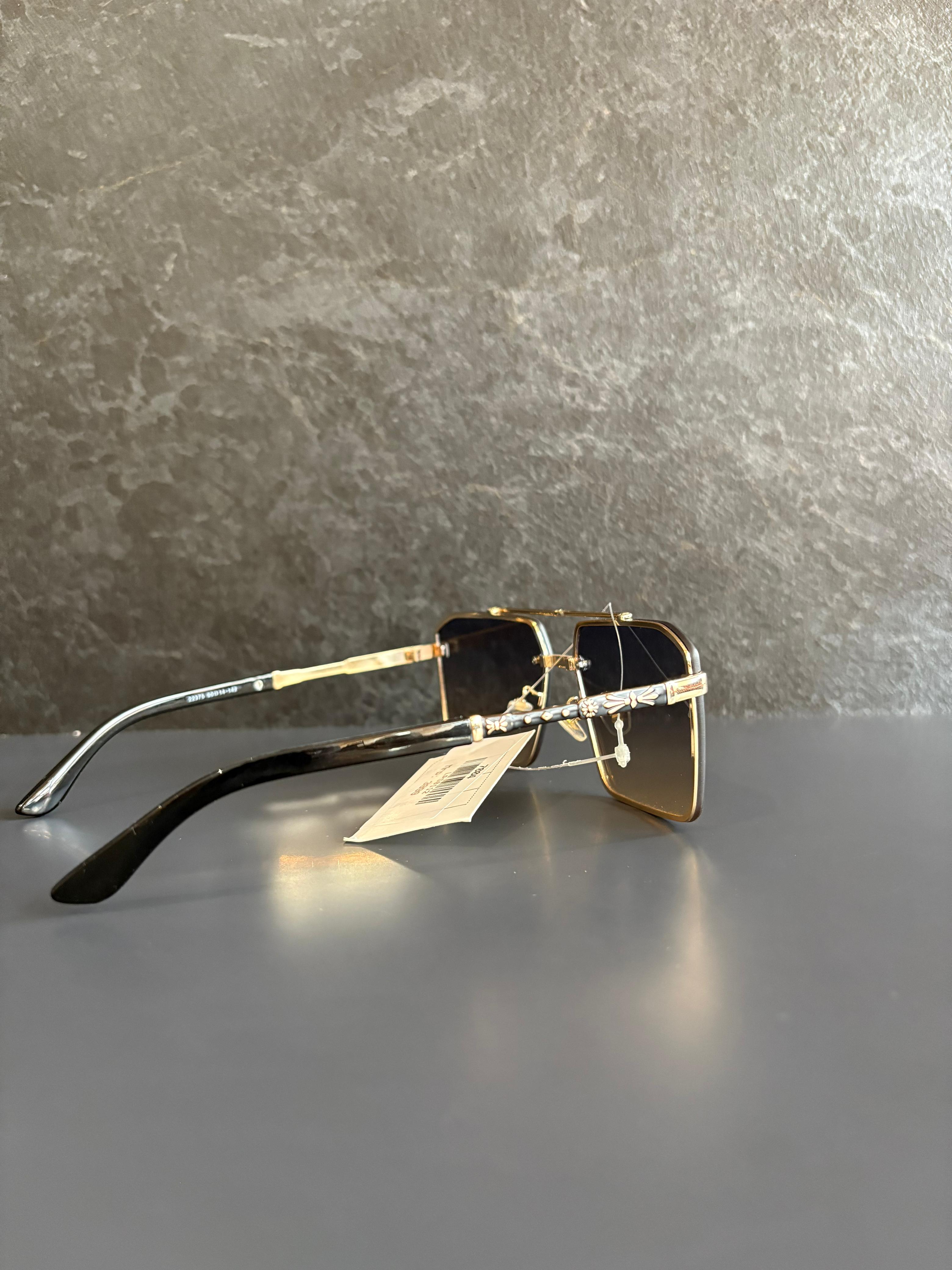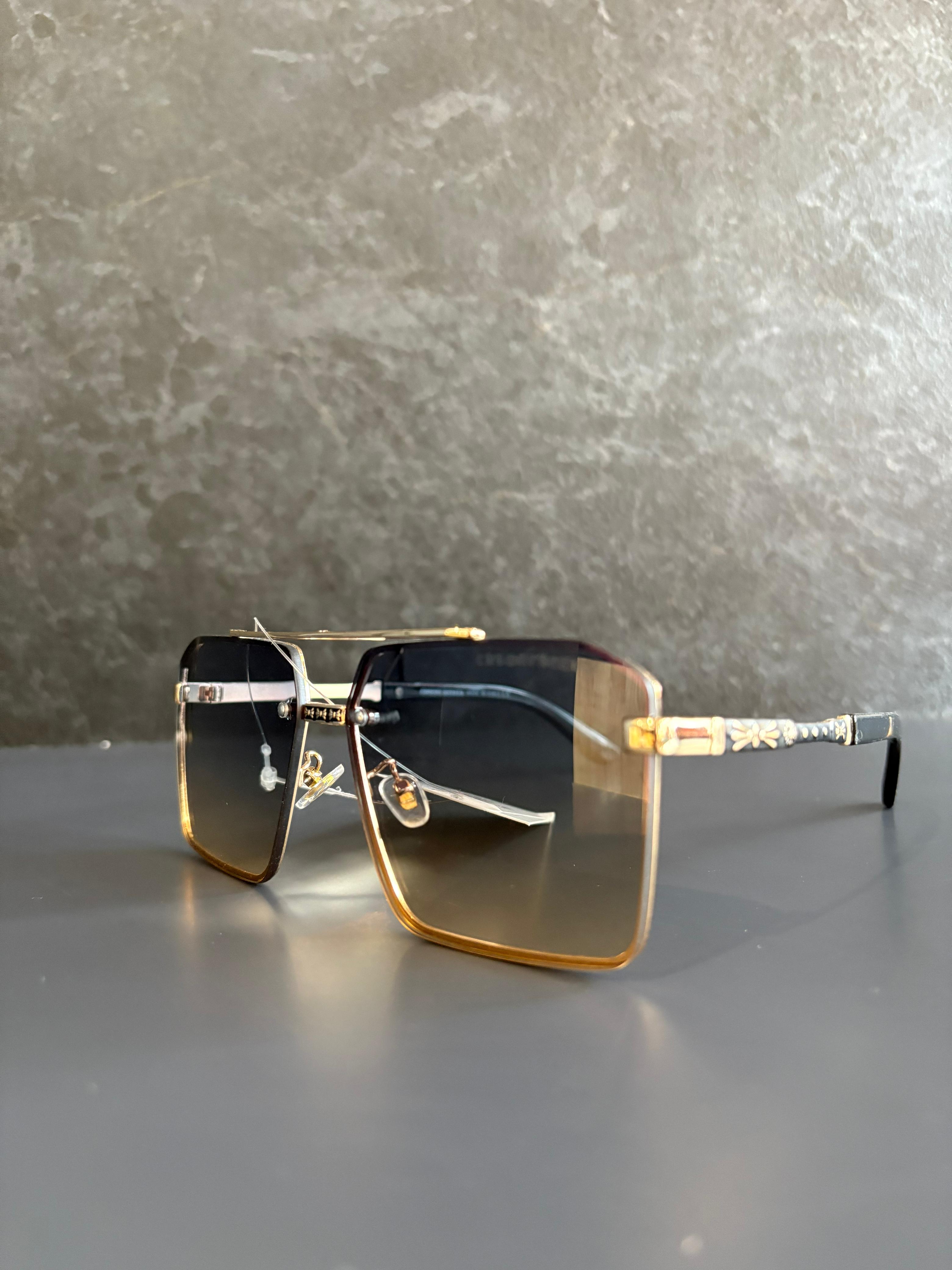 Showcase your bold sense of style with these stunning Chrome Hearts square sunglasses in a radiant gold finish. These designer sunglasses feature a large square lens design with brown gradient lenses that offer full UV protection while enhancing your look with a luxe, fashion-forward edge.