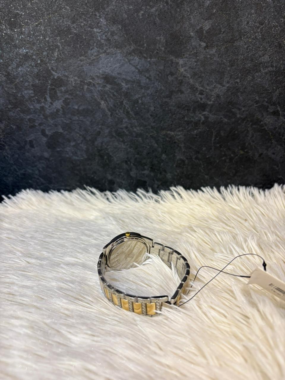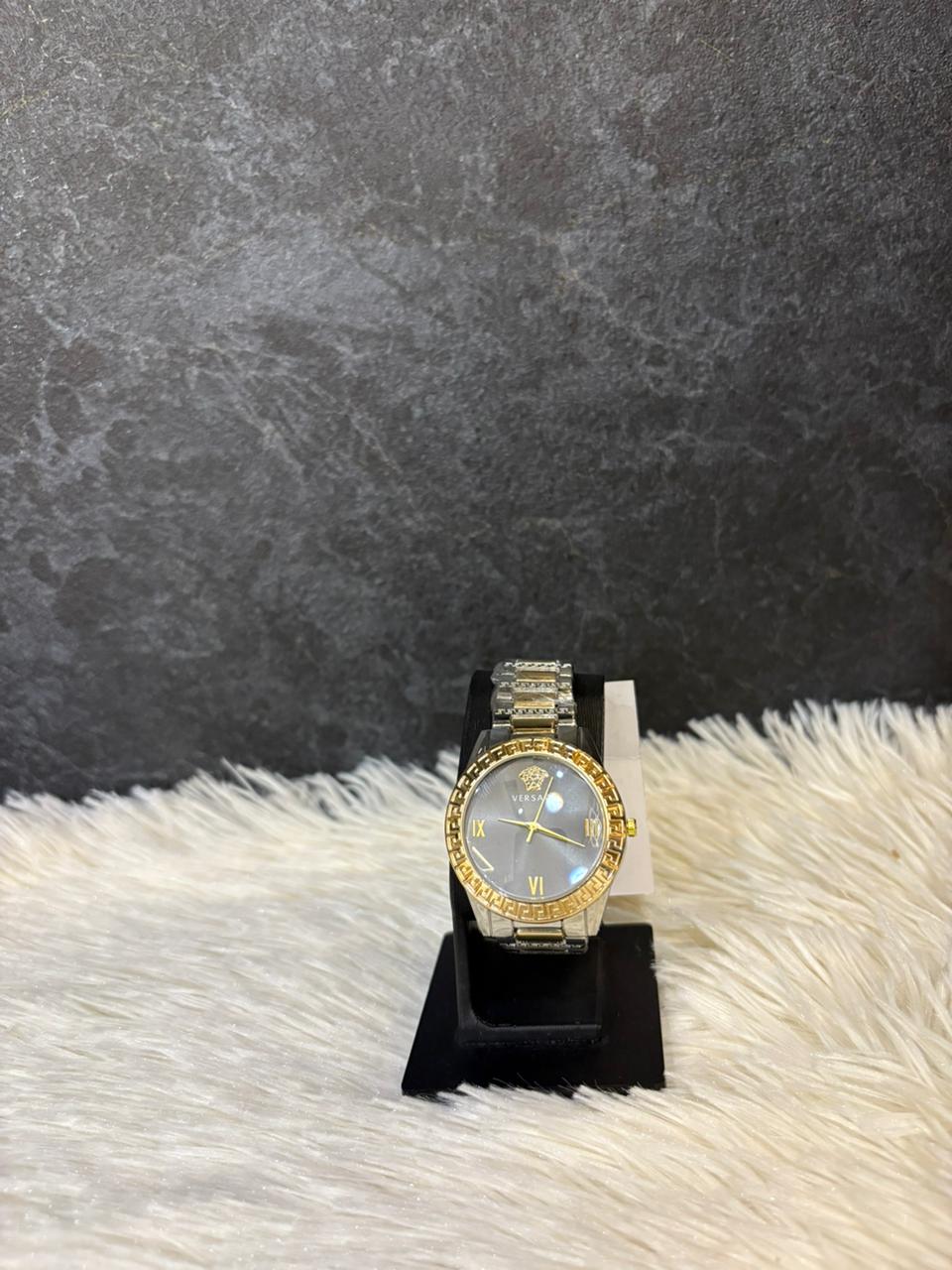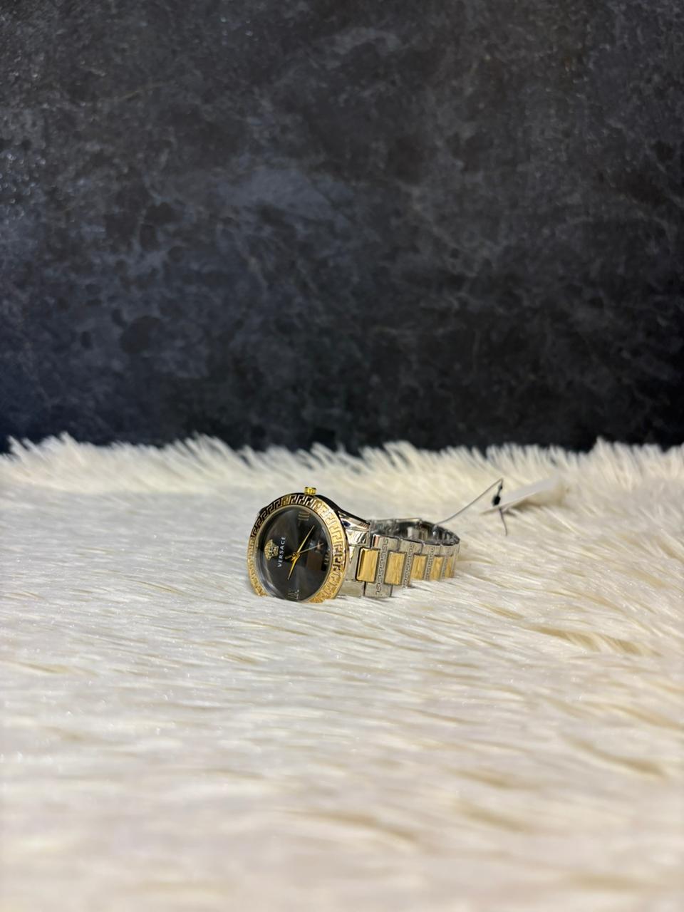 Exude elegance and sophistication with this stunning Versace women's watch, featuring a two-tone stainless steel bracelet in gold and silver accents. The bold black dial is adorned with gold Roman numeral markers and the iconic Versace Medusa logo, symbolizing timeless luxury and Italian craftsmanship. Perfect for both formal and everyday wear, this Swiss-made timepiece blends fashion and precision effortlessly.
